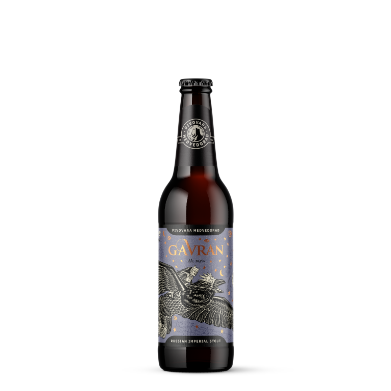Gavran je jako, gusto, crno pivo u čijem okusu dominiraju kava i crna čokolada. Cijeli karton sadrži 24 boce.